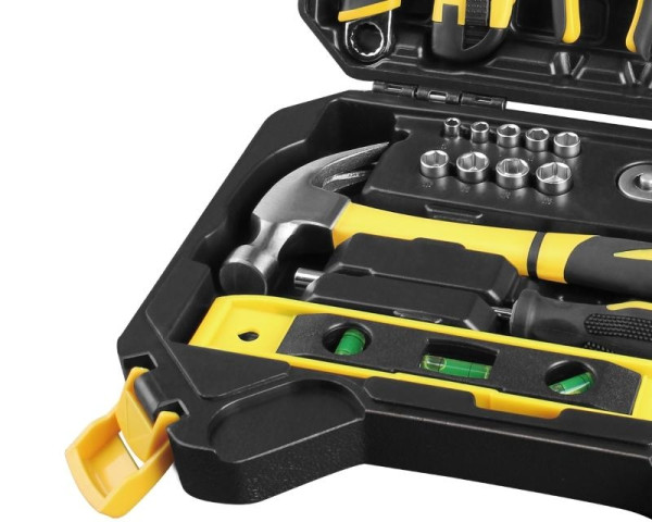 • 1x čekić, 1x francuski ključ, 1x skalpel, 1x dijagonalna klešta, 1x kombinovana klešta, 1x 3m merne trake, 9x imbus ključevi: 1.5mm-10mm, 9x 14" nasadnih ključeva: 5mm-13mm, 1x 14" moment ključ, 1x držač bitova, 1x libela, 32x bitova, 1x magnetni držač bitova